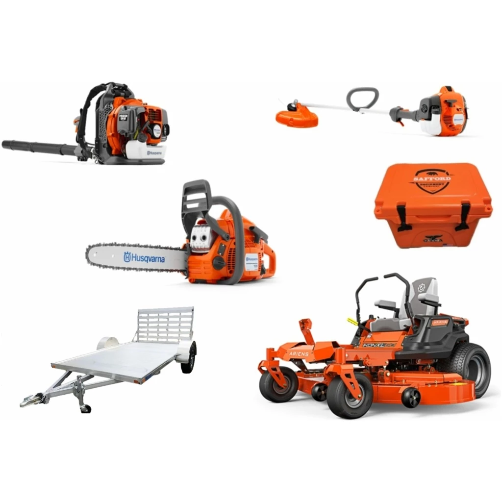 The AH4137 Ariens Mower Bundle, with an Ariens IKON XL 60 Zero Turn Mower and a blower, trimmer, and chainsaw by Husqvarna, will help you complete all your projects and chores around the house.