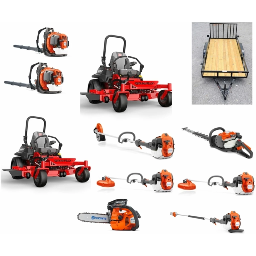 Seeing double has never felt better than with the GH611 Gravely Mower Bundle that gives you two Gravely Pro Turn 152 Zero Turn Mowers, two Husqvarna trimmers, two Husqvarna blowers, a Husqvarna edger, a Husqvarna hedge trimmer, a Husqvarna chainsaw, and a Husqvarna polesaw.
