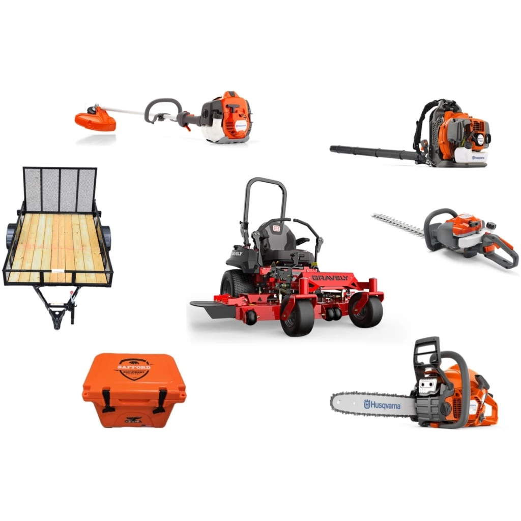 The GH626 Gravely Mower Bundle is here to help you accomplish a plethora of jobs on varied terrain with reliable gear like the Gravely Pro Turn 160 Zero Turn Mower (with a Yamaha engine), a blower, trimmer, and chainsaw by Husqvarana as well as a Caliber trailer.