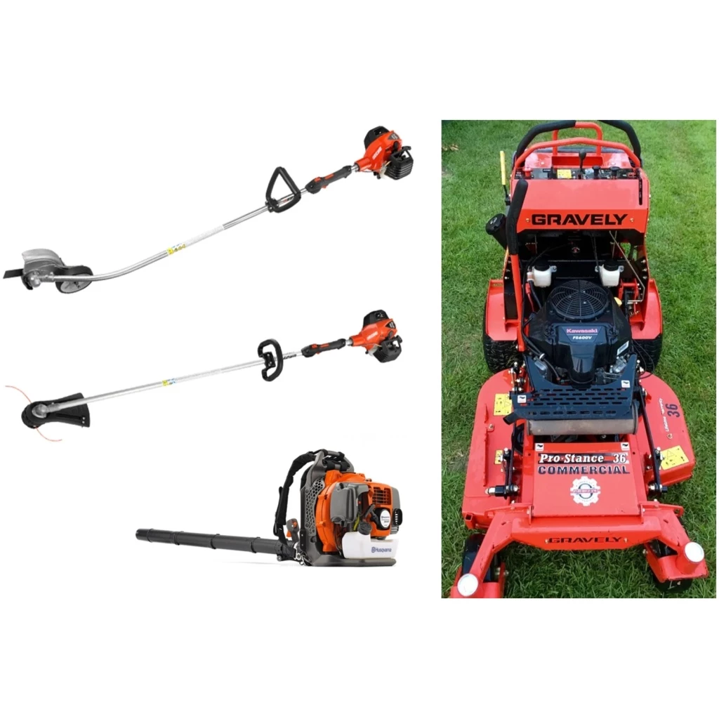 The GE700 Gravely Mower Bundle will help you cover more ground in less time (and with greater control) thanks to pro tools like the Gravely Pro-Stance 36 Stand On Mower and a trimmer and edger made by ECHO as well as a blower by Husqvarna.